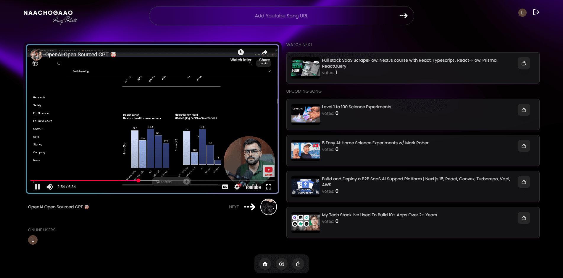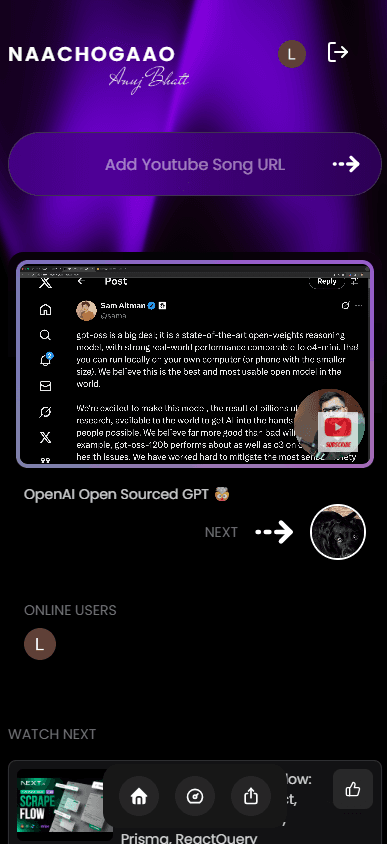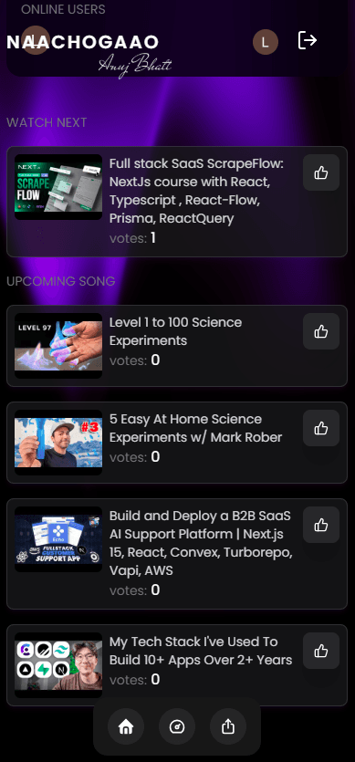 Naachogaao is an innovative, real-time, YouTube-based collaborative streaming platform designed for group entertainment and interactive content curation. It enables users to create virtual "rooms" where friends can join, add streams, vote on the playlist, and enjoy a dynamic, community-driven playback experience.